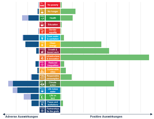 Für das Berichtsjahr 2024 wurde die SDG-Klassifizierung des betrachteten Portfolios erstmals vollständig in einem von der DZ BANK entwickelten Software-Tool durchgeführt. Die Überführung des bestehenden Regelwerks in das neue Tool ermöglichte hierbei auch Weiterentwicklungen und in Teilen sachgerechte Verschärfungen der Klassifizierungsmethodik. Dies führt neben der Verbesserung der Ergebnisqualität im Allgemeinen auch zu einer restriktiveren Anerkennung von positiven SDG-Beiträgen aus Handelsfinanzierungen. Das betrachtete Klassifizierungsportfolio zeigt, in Bezug auf die SDGs überwiegend positive Beiträge. So weisen innerhalb des betrachteten Klassifizierungsportfolios zum 31. Dezember 2024 etwa 63 Prozent des untersuchten Volumens mindestens einen positiven Beitrag auf. Dabei ist zu beachten, dass eine klassifizierte Wirtschaftsaktivität gleichzeitig positive als auch adverse SDG-Beiträge haben kann, die jeweiligen Beiträge bzw. Positionen sind somit nicht additiv. Positive Beiträge resultieren insbesondere aus der Stärkung kritischer Infrastrukturen (SDG 9) und durch die Stärkung des globalen Wohlstands (SDG 8). Darüber hinaus leisten Finanzierungen von erneuerbaren Energien einen positiven Beitrag bei der Bekämpfung des Klimawandels (SDG 13). Die adversen Beiträge resultieren hauptsächlich aus Finanzierungen in Verbindung mit dem SDG-Klima (SDG 13). Zusätzlich ergeben sich weitere adverse Beiträge in Bezug auf sauberen Wassereinsatz (SDG 6) und marine Ökosysteme: Ozeane, Meere und Meeresressourcen (SDG 14). Die DZ BANK analysiert kontinuierlich die adversen Beiträge und begleitet die Transformationsprozesse ihrer Kunden aktiv, um auf die Vermeidung adverser Beiträge hinzuwirken. Die Abbildung zeigt die aggregierten positiven und adversen Beiträge des betrachteten Klassifizierungsportfolios zu den 17 SDGs.