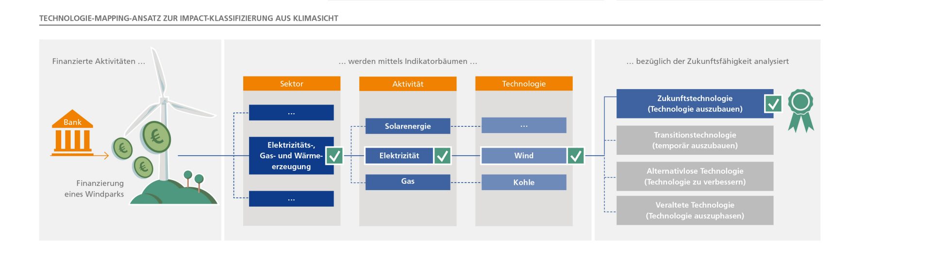 Das Technologie-Mapping baut auf der SDG-Klassifizierung (inkl. des Aktivitätensplittings) auf und zielt darauf ab, Transparenz über die besonders relevanten Klima-Wirkungsbeiträge zu schaffen. Hierzu richtet sich der Blick auf die hinter einer finanzierten Wirtschaftsaktivität stehende Technologie. Grundlegende Annahme ist hierbei, dass die im Rahmen einer wirtschaftlichen Aktivität eingesetzte Technologie wesentlichen Einfluss auf deren Klimaauswirkungen hat. Dabei sind Einstufungen in vier Kategorien möglich: (1) Zukunftstechnologie, (2) Transitionstechnologie, (3) alternativlose Technologie und (4) veraltete Technologie. Die inhaltliche Ausgestaltung der Methoden für beide Ansätze, die SDG-Klassifizierung und das Technologie-Mapping, erfolgte in Arbeitsgruppen unter Einbeziehung aller relevanten Fachbereiche sowie von Sektorexpertinnen und -experten. Die Ergebnisse für alle Sektoren wurden in sogenannten Indikatorenbäumen umfassend aufbereitet und dokumentiert. Der Ansatz zum Technologie-Mapping findet auf dieselben Portfolien Anwendung wie die SDG-Klassifizierung.