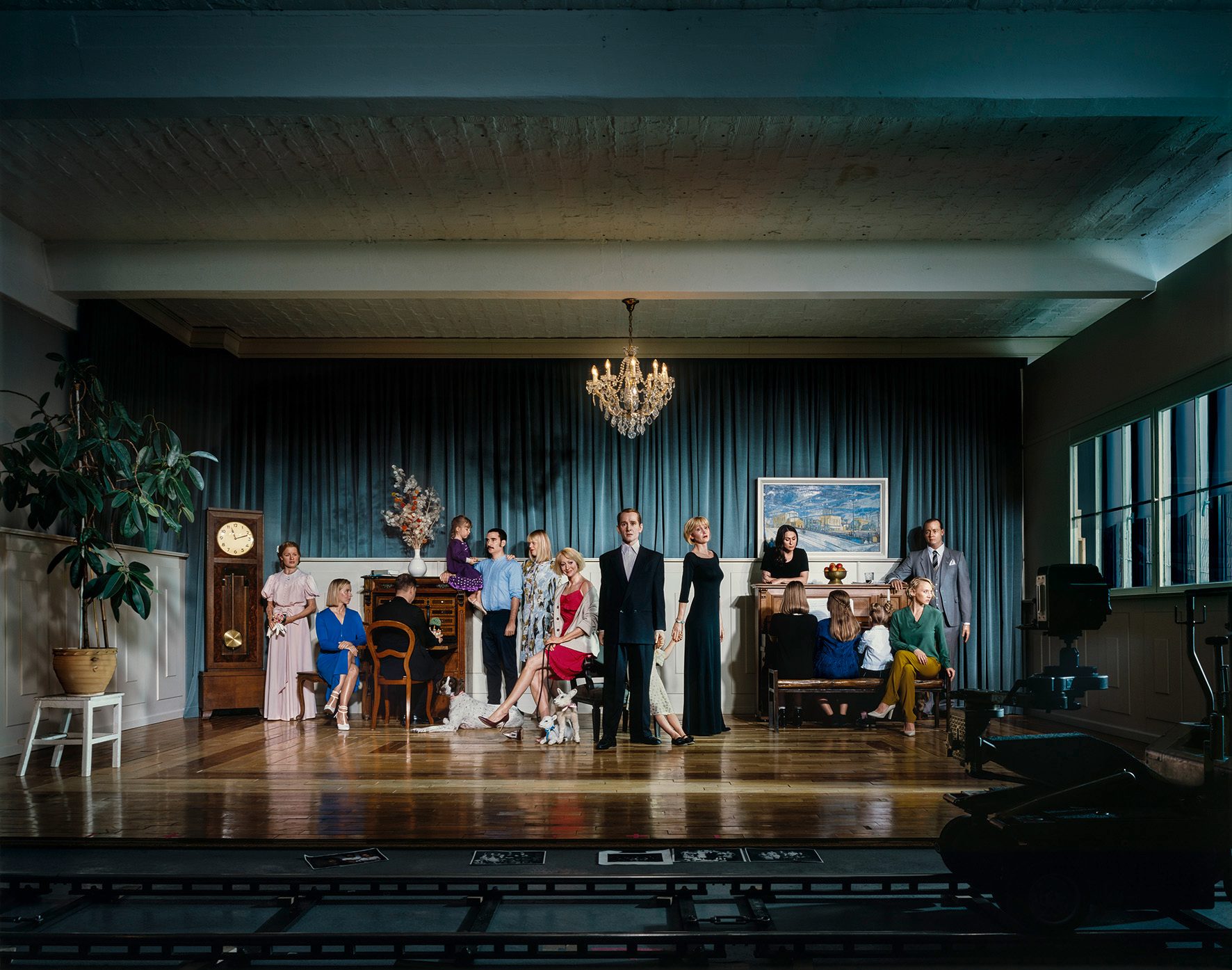 In seiner Werkgruppe „Mischpoche“, 2019, hat Andreas Mühe (*1979, Karl-Max-Stadt, DDR) seine Familienmitglieder in Anlehnung an ein klassisches Familienporträt in unterschiedlichen Konstellationen auf einer Bühne inszeniert. Um die verstorbenen Protagonisten mit ins Bild setzen zu können, ließ er sie – in Zusammenarbeit mit unterschiedlichen Gewerken wie etwa dem Porzellanhersteller Rosenthal – als lebensgroße Figuren nacharbeiten und konfrontiert so die Lebenden mit den Toten.