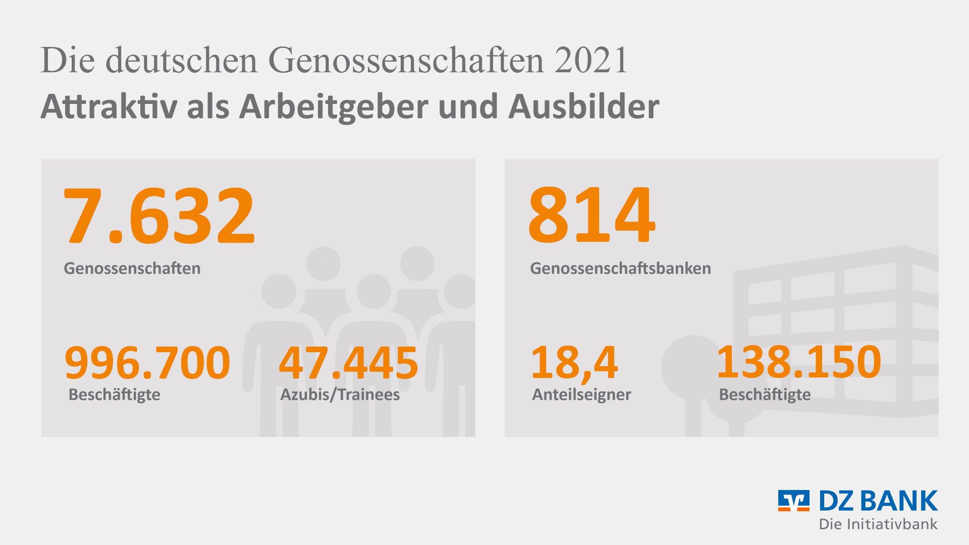 Die Genossenschaftsorganisation ist weiter ein bedeutender Arbeitgeber und Ausbilder in Deutschland. Einschließlich aller Beschäftigten bei REWE Group und EDEKA-Verbund arbeiten rund 977.600 Voll- und Teilzeitkräfte bei Genossenschaften, ihren Zentralen und Verbänden. Ende 2020 waren 47.445 Azubis und Trainees in der Ausbildung, über 1.500 mehr als im Vorjahr. Da die Corona-Krise bei Lebensmitteleinzel-händlern für mehr Umsatz und Arbeit gesorgt hat, dürfte die Beschäftigtenzahl im laufenden Jahr bei den Handelsgenossenschaften und in der gesamten Genossenschaftsorganisation weiter steigen.