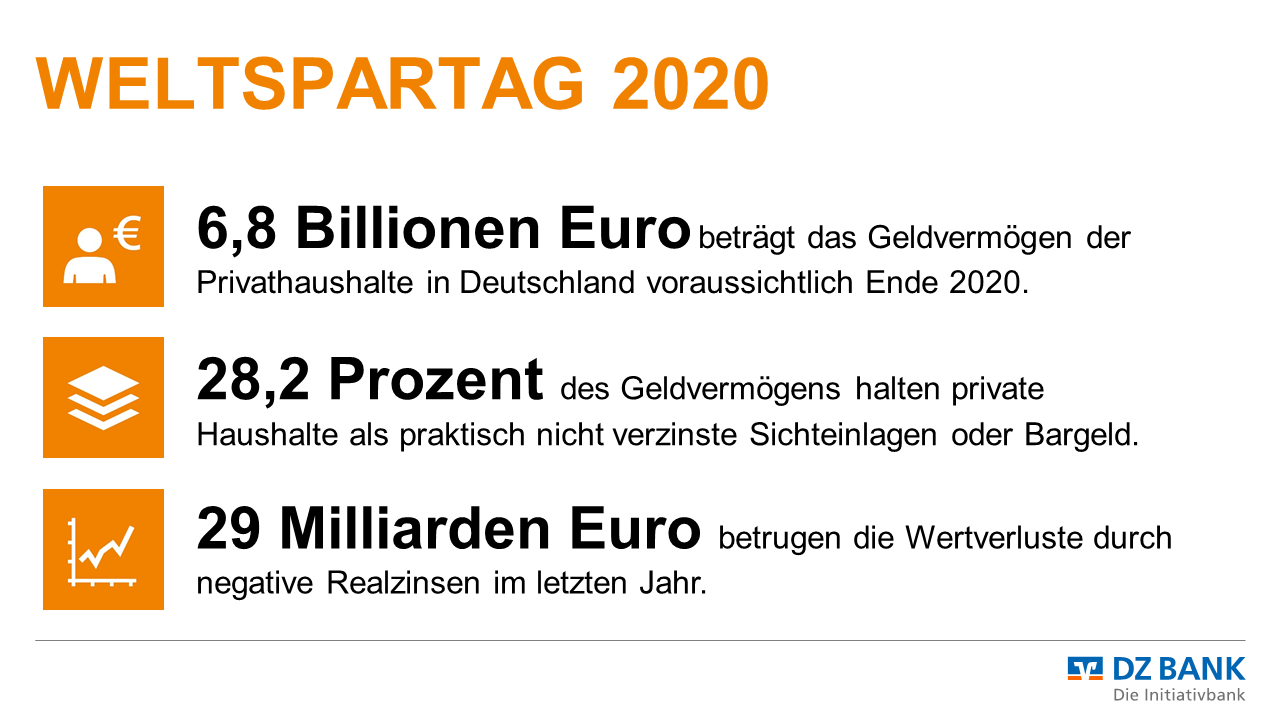 Eine neue Studie des DZ BANK Research zum Weltspartag 2020 zeigt, dass die Sparquote im zweiten Quartal dieses Jahres mit über 20 Prozent zwar historisch hoch war, der Anteil nicht angelegter Finanzmittel in Deutschland aber weiter zugenommen hat – auf 28,2 Prozent des privaten Geldvermögens. Durch extrem niedrige Zinsen und den Investitionsstau erleiden die privaten Haushalte in Deutschland seit 2010 Netto-Zinseinbußen von 379 Milliarden Euro. Wenn man Rentenpapiere und Versicherungsanlagen hinzurechnet waren es in den vergangenen elf Jahren sogar 732 Milliarden Euro. Gleichzeitig stieg zuletzt die Bereitschaft der Deutschen, in Aktien anzulegen. Zwar sind bisher nur knapp sieben Prozent des privaten Geldvermögens in diese Anlageform investiert, der Mittelzufluss in börsennotierte Aktien hat insgesamt aber zugenommen. Vom ersten zum zweiten Quartal 2020 stieg dieser von 11,4 Milliarden Euro auf 13 Milliarden Euro.