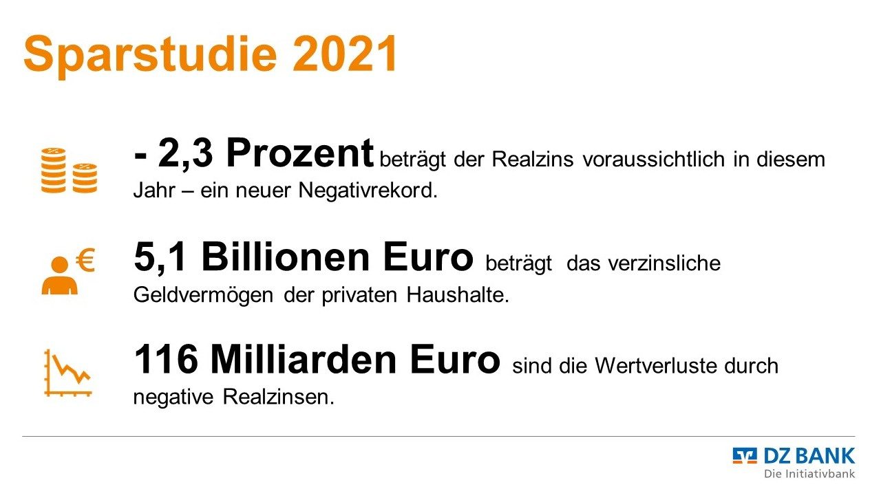 Der Wertverlust auf das verzinsliche Geldvermögen der deutschen Privathaushalte in Höhe von 5,1 Billionen Euro beträgt in diesem Jahr mehr als 116 Milliarden Euro – so das Ergebnis einer Studie des DZ BANK Research, die zur Weltsparwoche 2021 veröffentlicht wurde. Bezogen auf die Gesamtbevölkerung sind das fast 1.400 Euro pro Kopf. Michael Stappel, Leiter Makroökonomik, begründet die Entwicklung mit kaum vorhandenen Zinsen und der stark steigenden Inflation. Nach seinen Berechnungen gibt es einen negativen Realzins in Höhe von 2,3 Prozent – das ist ein neuer Negativrekord.