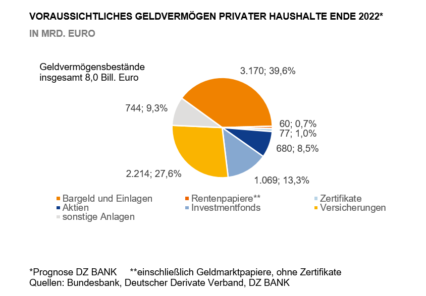 Nach den vergangenen beiden Boom-Jahren geht es zudem für Aktien nicht mehr nur noch nach oben. „Der Kriegsausbruch, die Zinswende und Corona-Lockdowns in China belasten derzeit die Kursentwicklung. Das Geldvermögen schnellt durch diese Asset-Klasse deshalb nicht mehr in die Höhe. Erfreulicherweise bleibt die neue Aktienkultur aber intakt – beim Vermögensaufbau ist ein langfristiges Denken wichtig“, sagt Stappel. Trotz der Aktienkursrückgänge gab es im ersten Quartal 2022 laut Bundesverband Investment und Asset Management e.V. weitere Neuanlagen in Fonds. Aktien, Investmentfonds und Zertifikate machen Ende 2022 voraussichtlich rund 23 Prozent des Geldvermögens aus. 2020 waren es noch 20 Prozent. Die weiterhin größte Anlageform sind Bankeinlagen und Bargeld mit voraussichtlich fast 40 Prozent.