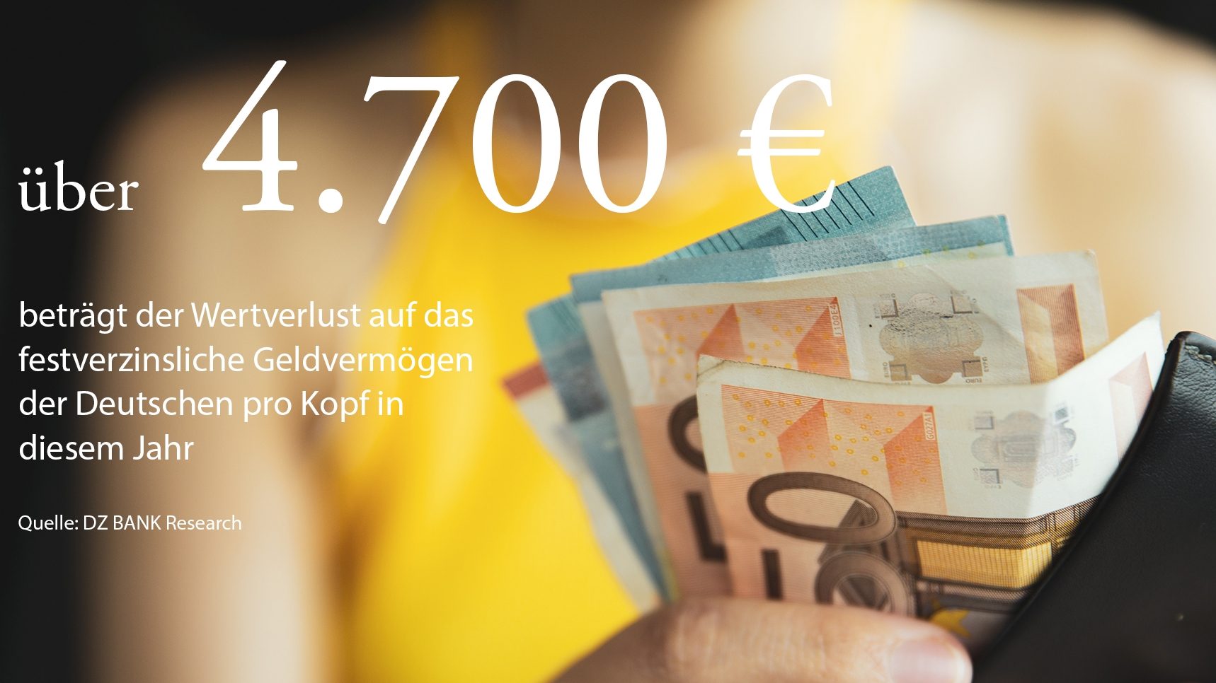 Der Wertverlust auf das verzinsliche Geldvermögen der deutschen Privathaushalte in Höhe von 5,7 Billionen Euro beträgt in diesem Jahr voraussichtlich 395 Milliarden Euro – so das Ergebnis einer Studie des DZ BANK Research, die zur Weltsparwoche 2022 veröffentlicht wurde. Bezogen auf die Gesamtbevölkerung sind das über 4.700 Euro pro Kopf. Laut Michael Stappel, Leiter Makroökonomik und Autor der Studie, liegt das an der extrem hohen Inflation. Nach seinen Berechnungen gibt es einen negativen Durchschnitts-Realzins in Höhe von minus 6,9 Prozent – das ist ein neuer Negativrekord und 4,4 Prozentpunkte tiefer als der letztjährige Wert. Insgesamt beträgt das Geldvermögen der Haushalte 7,7 Billionen Euro.