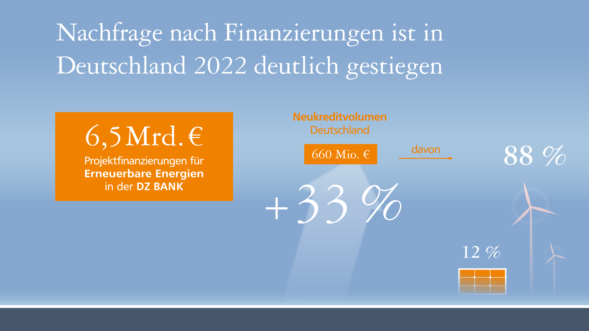 Obwohl das Genehmigungsvolumen im deutschen Markt für Erneuerbare Energien derzeit stockt, konnten wir unser Neukreditvolumen für den Standort Deutschland um rund ein Drittel steigern und damit 2022 rund 660 Millionen Euro zusagen. Unser Kundenportfolio reicht vom einzelnen Landwirt als Betreiber eines Bürgerwindparks mit vielen Beteiligten bis hin zum Groß-Projektierer, der riesige Windparks in Deutschland baut. Wir haben im letzten Jahr viele neue Kunden dazugewonnen – auch, weil die DZ BANK eine sehr gute Bonität aufweisen kann und das für unsere Projektpartner im turbulenten Marktumfeld immer wichtiger wird.