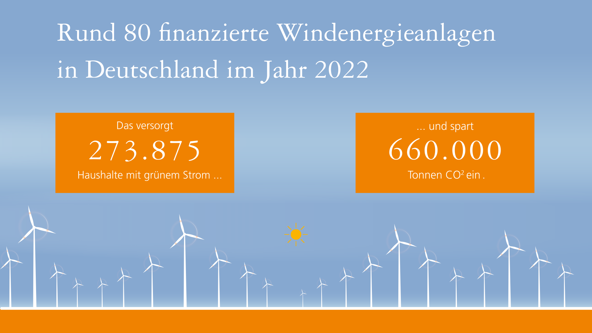 Insgesamt haben wir 2022 in Deutschland allein rund 80 Windkraftanlagen finanziert. Sie versorgen rund 280.000 Haushalte mit grünem Strom – das spart pro Jahr 660.000 Tonnen CO2 ein. Windenergie machen den Großteil unserer Projekte aus – nämlich knapp 90 Prozent. Beim Rest handelt es sich um Photovoltaikanlagen.