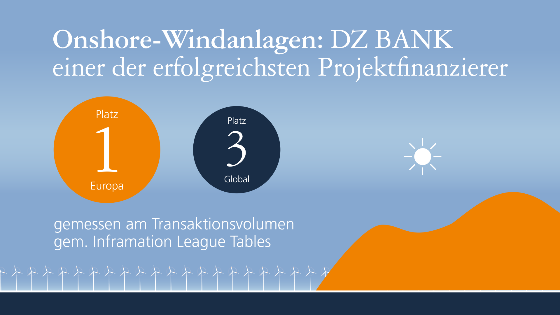 Der Ausbau der Erneuerbaren Energien schreitet in Deutschland voran. Das zeigt sich auch in der Strukturierten Finanzierung der DZ BANK. Auf rund 7,4 Milliarden Euro ist das Gesamtportfolio Erneuerbare Energien im vergangenen Jahr angewachsen. Das entspricht einem deutlichen Zuwachs: Zum Jahresende 2022 lag es bei 6,5 Milliarden Euro. Laut der Datenbank Inframation ist die Bank im Bereich Onshore der erfolgreichste Projektfinanzierer Erneuerbarer Energien in Europa. Im globalen Vergleich belegen wir den dritten Platz.