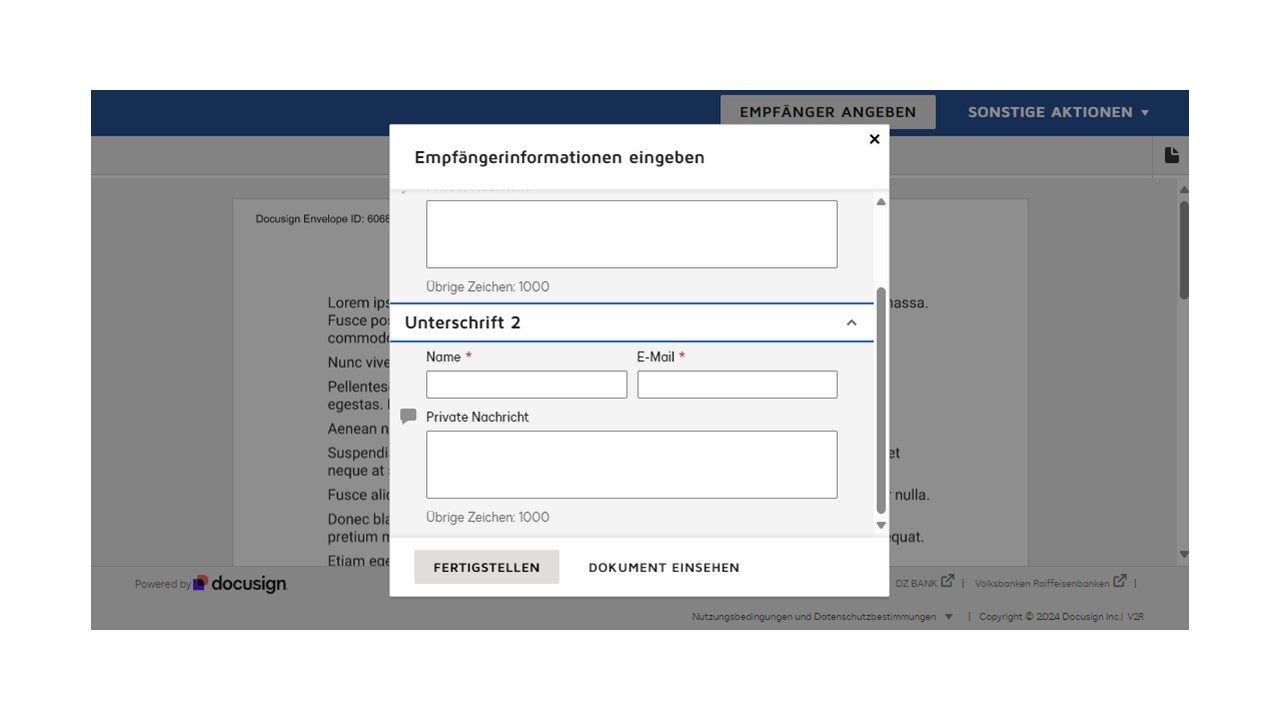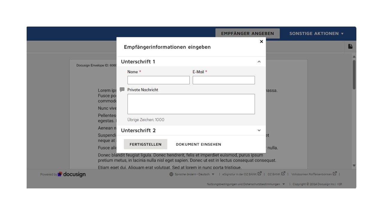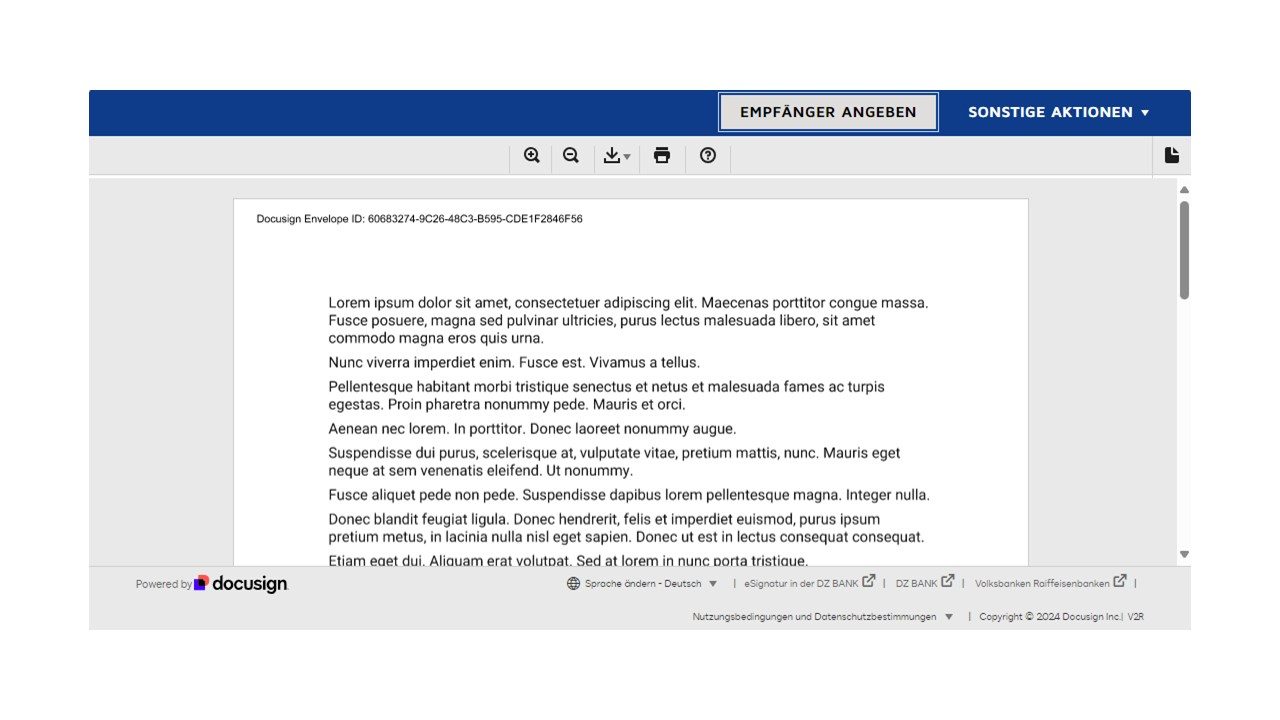 DocuSign ist ein Anbieter für eine Plattform zur Signierung von Dokumenten unter Einbindung von externen Vertragspartnern. DocuSign ist mit einer der am weitesten verbreiteten Anbieter auf dem Markt Quasi-Standard, weshalb die Plattform DocuSign auch in der DZ BANK verwendet wird.