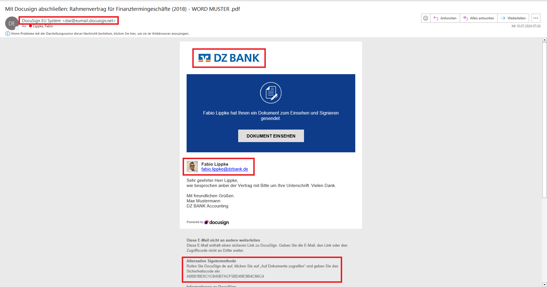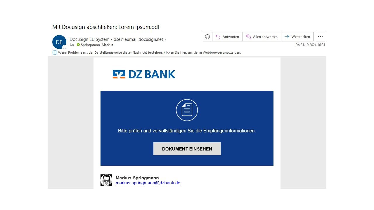 - Die E-Mail enthält den Namen und die E-Mailadresse eines Mitarbeitenden der DZ BANK.