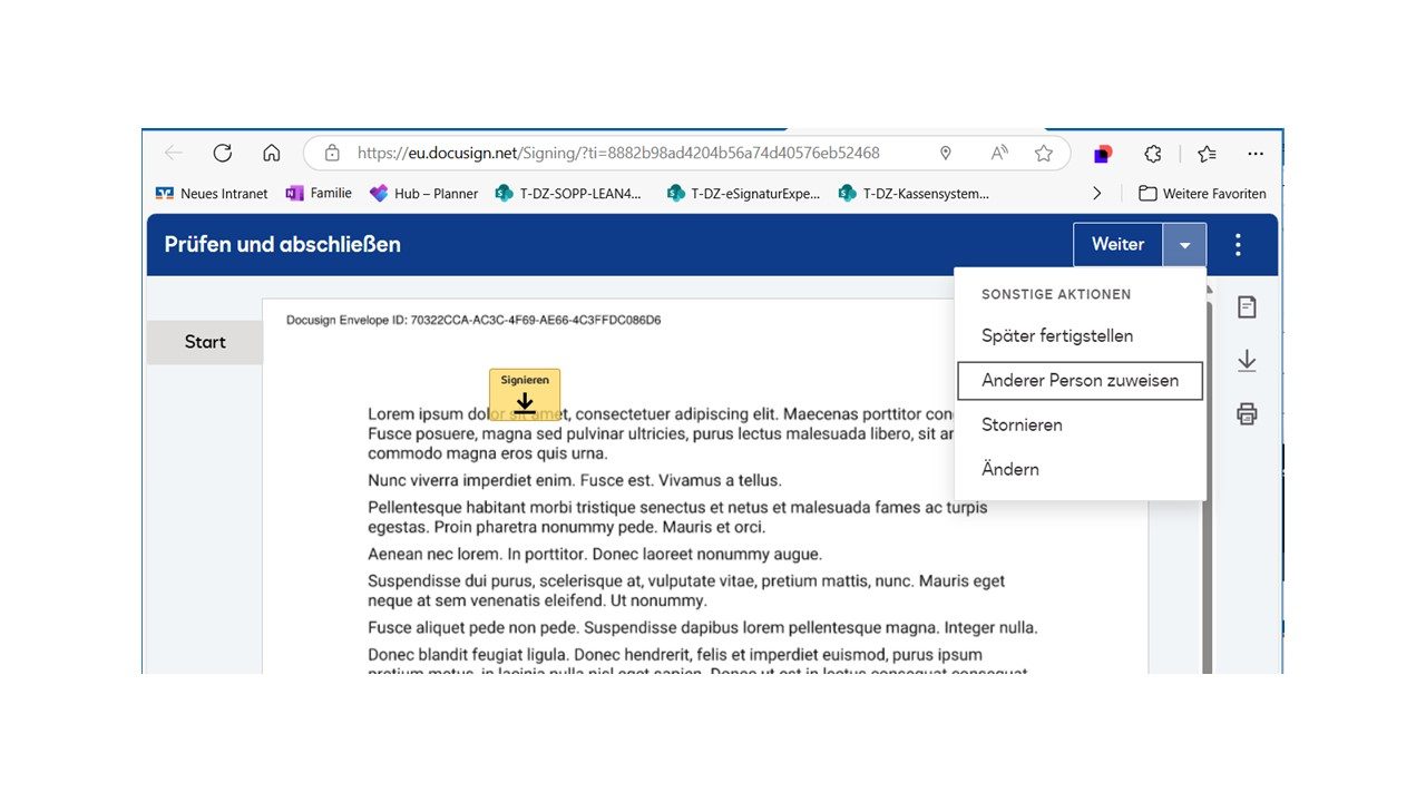Wenn Sie einen Dokument nicht selber signieren wollen, können Sie diesen auch einer anderen Person zuweisen. Öffnen Sie dafür das Dokument, in dem Sie in der E-Mail "Dokument einsehen" auswählen. Das Dokument öffnet sich im Browser. Klicken sie nun auf das kleine Dreieck / Pfeil neben "Weiter". Es öffnen sich weitere Optionen, hier wählen Sie bitte "Anderer Person zuweisen" aus.
