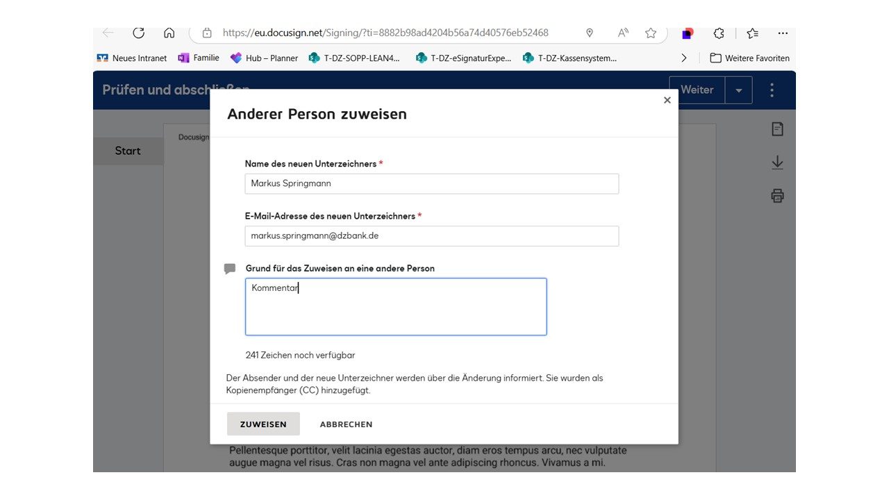 Sobald Sie "zuweisen" wählen wird die von Ihnen eingetragene Person an Ihrer Stelle als Unterzeichner in den Vertrag aufgenommen. Docusign versendet automatisch eine E-Mail, um diese Person zu informieren.